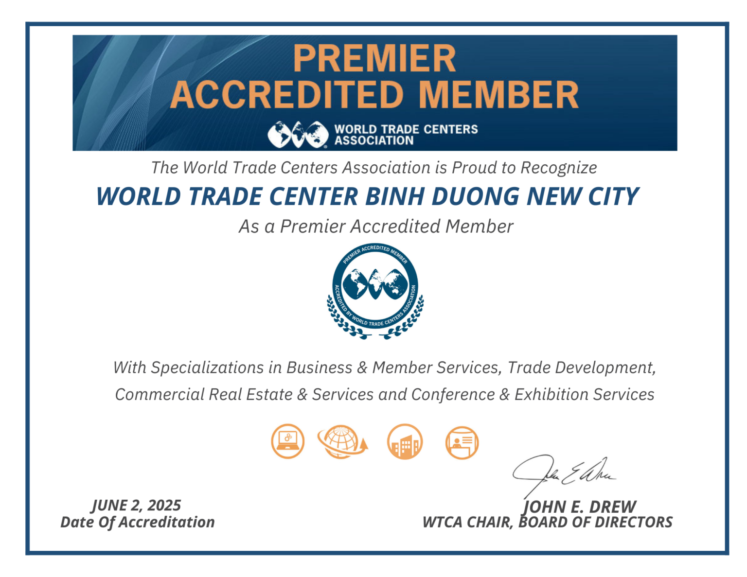World Trade Center Binh Duong New City was awarded Premier Accredited Member by the World Trade Centers Association (WTCA) with specializations in all categories: Trade Development, Commercial Real Estate & Services, Business & Member Services, and Conferences & Exhibitions. This achievement demonstrates that World Trade Center Binh Duong New City meets the WTCA quality standards and provides exceptional services and facilities, embodying the very best of the WTCA.